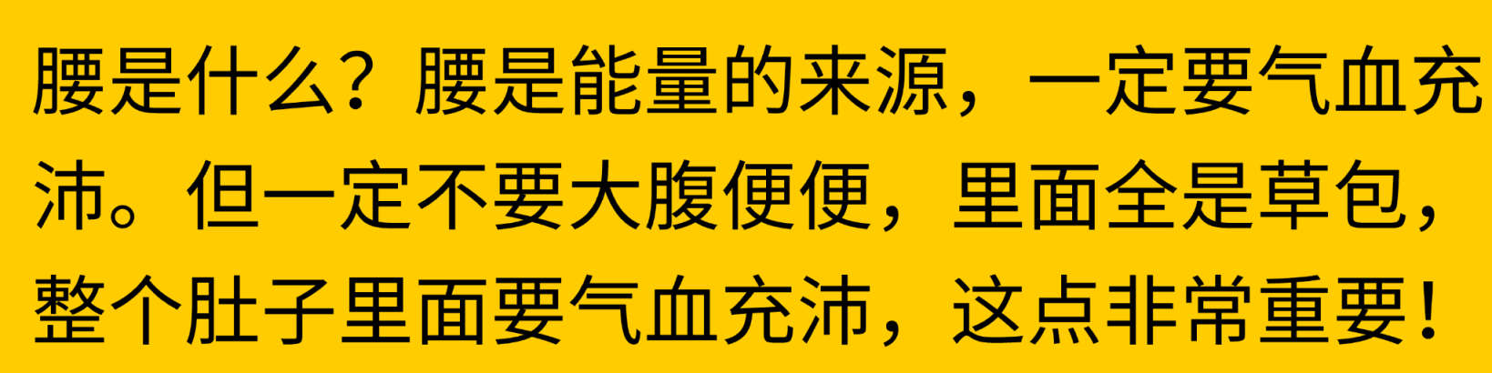 师:其实最好的是那个背带裤。一定不要把腰带扎的咔哧好紧呐…这小腰细的。腰是什么呢?腰是能量的来源,一定要气血充沛。但是呢一定不要大腹便便,里面全是草包,但是整个肚子里面要气血充沛,这点非常重要!