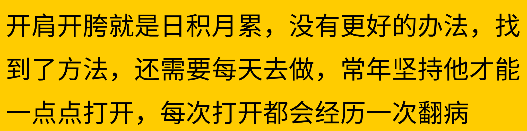 师:开肩开胯就是日积月累,没有更好的办法,找到了方法,还需要每天去做,常年坚持他才能一点点打开,每次打开都会经历一次翻病,每次翻病都会非常痛苦,筋发生变化,症状也会发生变化,每上一个台阶,都要经历思想,肉体的折磨,你才能往上走,只要不是练伤,突然出现一些症状加重都是好事。