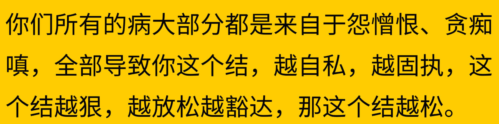 师:你们所有的病大部分都是来自于怨憎恨,贪痴嗔,全部导致你这个结,你看这抽象成一个圆圈,就往里面抠,如果这是心的话,一切都是向心性凝缩,就是说我们越自私,越固执,这个结越狠,越放松越豁达,那这个结越松。