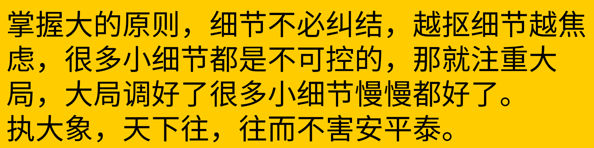![]() 原图 下载 师:掌握大的原则,细节不必纠结,越抠细节越焦虑,很多小细节都是不可控的,那就注重大局,大局调好了很多小细节慢慢都好了。 执大象,天下往,往而不害安平泰。 大象就是我们的整个精神状态、体力、意志、是否以开放的心态面对整个世界?只要始终抱着这种精神,都不会出大问题。 查看得明学习引导>>