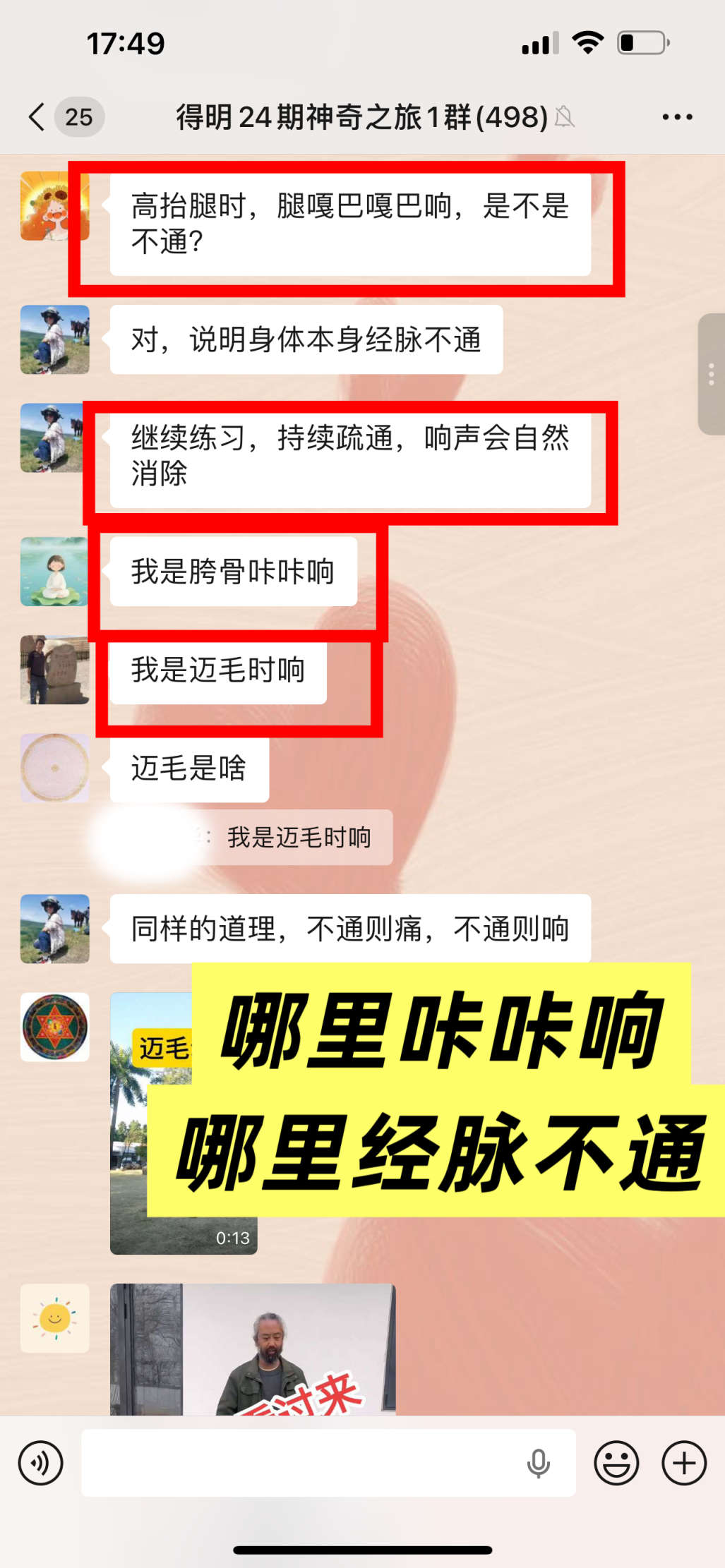 哪里咔咔响,哪里经脉不通。腿咔咔响,胯骨咔咔响,迈毛时响。