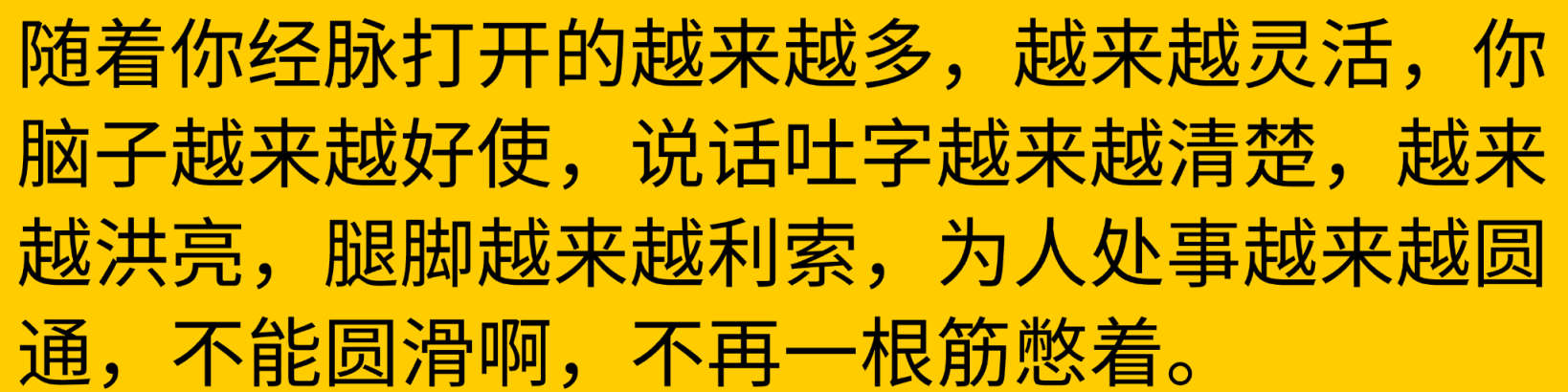 师:随着你经脉打开的越来越多,越来越灵活,你脑子越来越好使,说话吐字越来越清楚,越来越洪亮,腿脚越来越利索,为人处事越来越圆通,不能圆滑啊,不再一根筋憋着。
