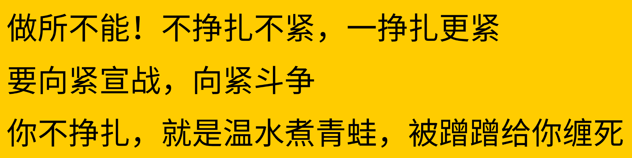 你们记住啊,你们不挣扎还不紧,一挣扎就更紧,一挣扎你就知道紧了,要向紧宣战,向紧斗争,你不挣扎,就是温水煮青蛙,被蹭蹭给你缠死了。