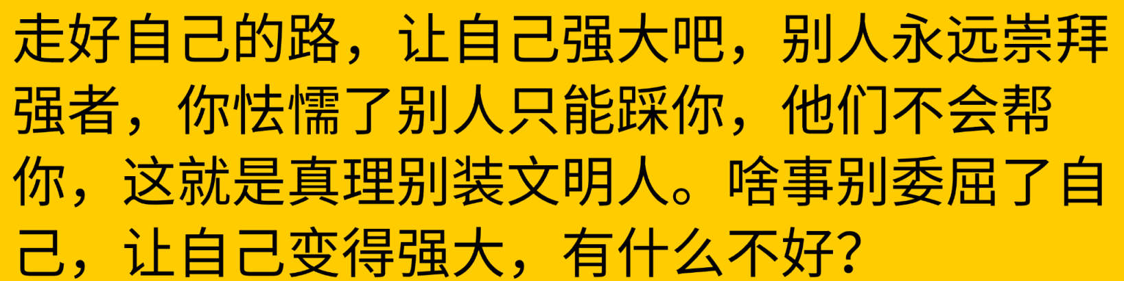 师:走好自己的路,让自己强大吧,别人永远崇拜强者,你怯懦了别人只能踩你,他们不会帮你,这就是真理别装文明人。啥事啊?!别委屈了自己,让自己变得强大,有什么不好?别在意别人异样的眼光。