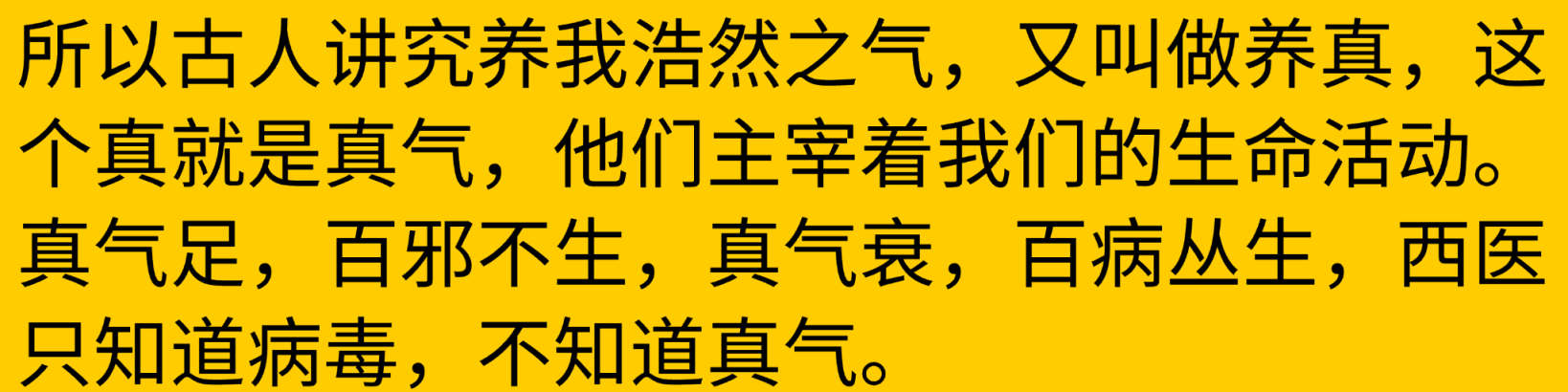 师:所以古人讲究养我浩然之气,又叫做养真,这个真就是真气,他们主宰着我们的生命活动。真气足,百邪不生,真气衰,百病丛生,西医只知道病毒,不知道真气。