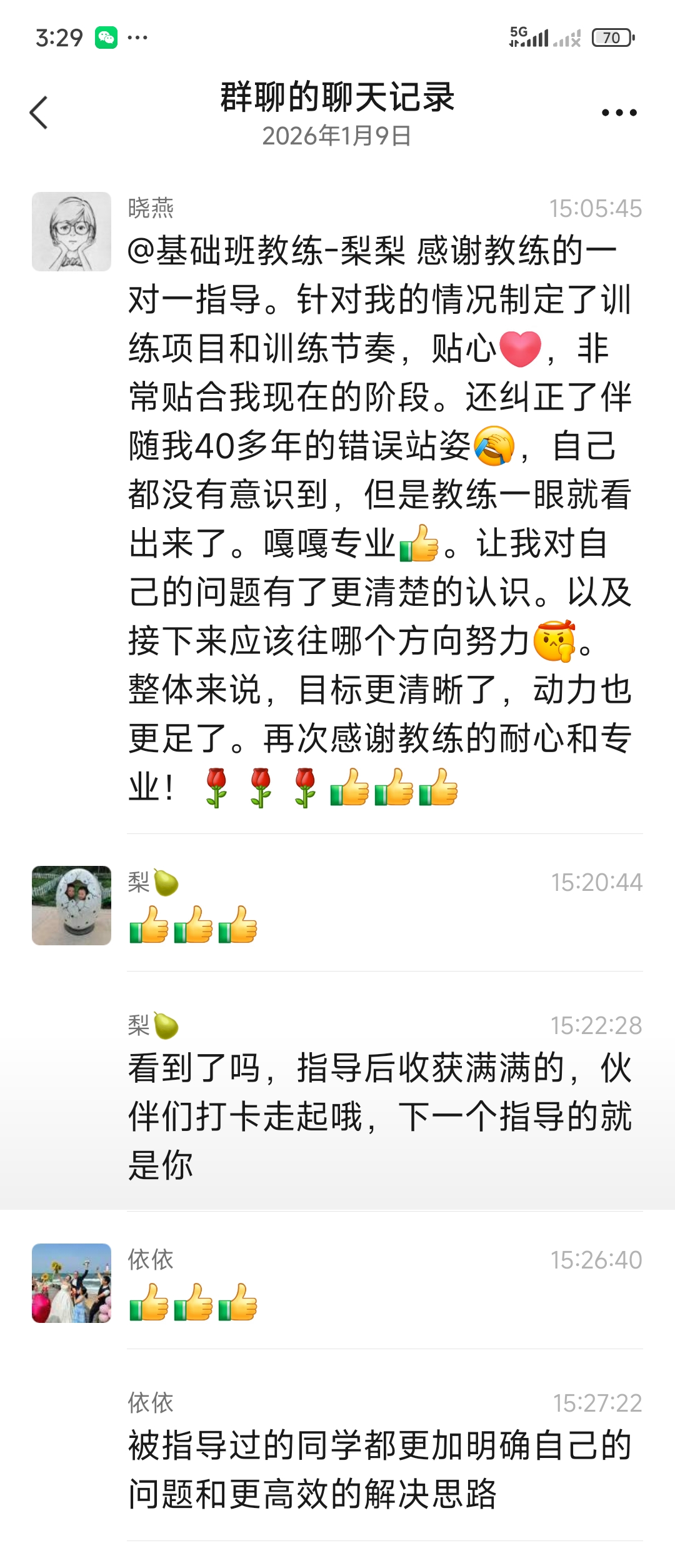 @基础班教练-梨梨 感谢教练的一对一指导。针对我的情况制定了训练项目和训练节奏,贴心[爱心],非常贴合我现在的阶段。还纠正了伴随我40多年的错误站姿[捂脸],自己都没有意识到,但是教练一眼就看出来了。嘎嘎专业[强]。让我对自己的问题有了更清楚的认识。以及接下来应该往哪个方向努力[加油]。整体来说,目标更清晰了,动力也更足了。再次感谢教练的耐心和专业![玫瑰][玫瑰][玫瑰][强][强][强]