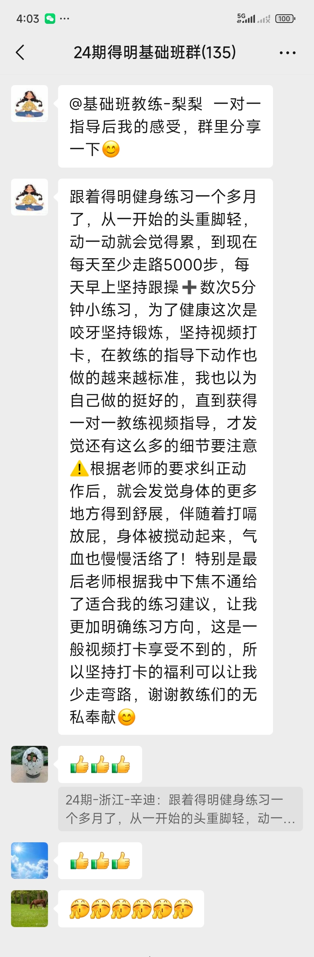 跟着得明健身练习一个多月了,从一开始的头重脚轻,动一动就会觉得累,到现在每天至少走路5000步,每天早上坚持跟操➕数次5分钟小练习,为了健康这次是咬牙坚持锻炼,坚持视频打卡,在教练的指导下动作也做的越来越标准,我也以为自己做的挺好的,直到获得一对一教练视频指导,才发觉还有这么多的细节要注意⚠️根据老师的要求纠正动作后,就会发觉身体的更多地方得到舒展,伴随着打嗝放屁,身体被搅动起来,气血也慢慢活络了!特别是最后老师根据我中下焦不通给了适合我的练习建议,让我更加明确练习方向,这是一般视频打卡享受不到的,所以坚持打卡的福利可以让我少走弯路,谢谢教练们的无私奉献😊