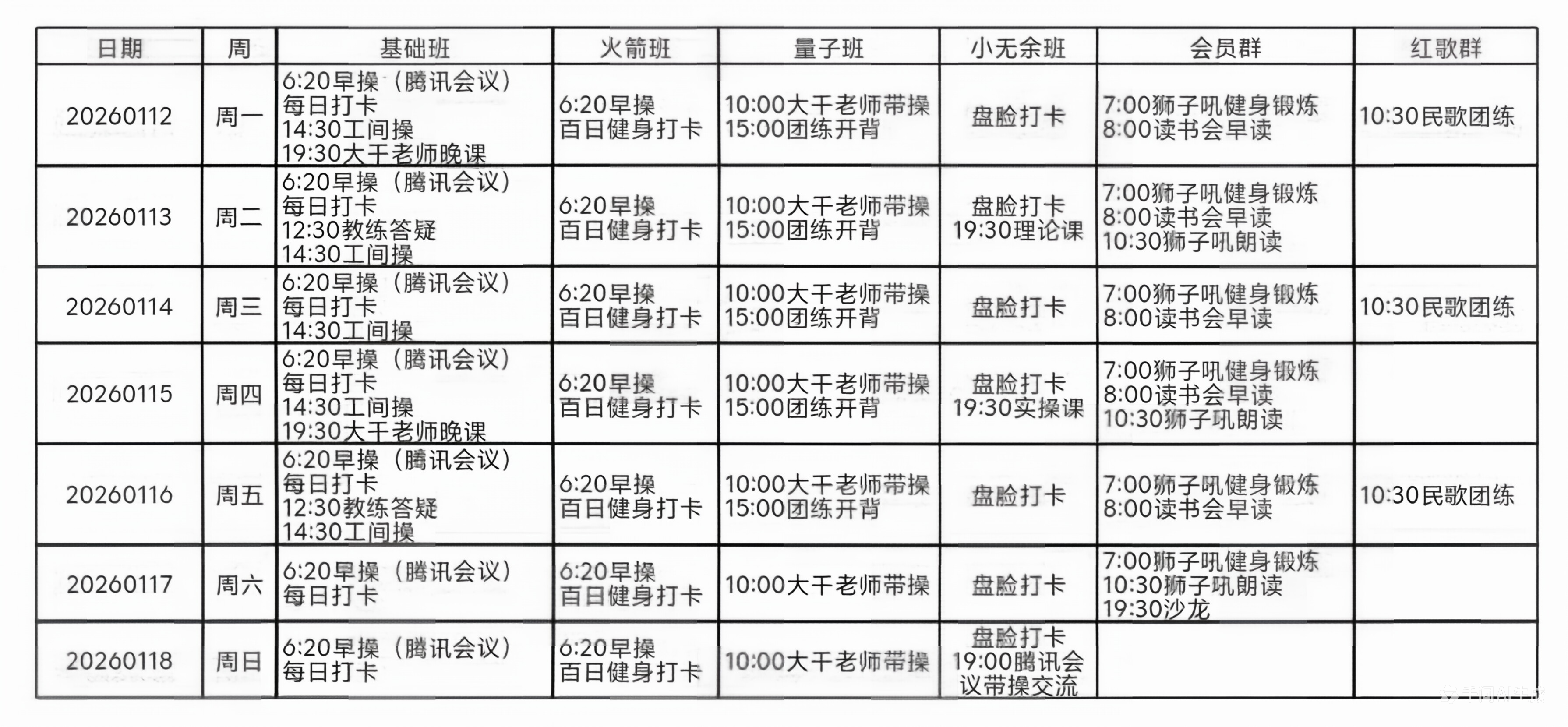 会员各班级本周课程活动安排(20260112-20260118)