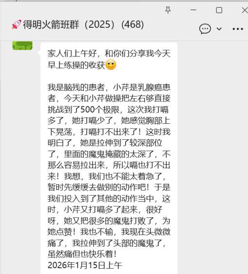 我是脑残的患者,小芹是乳腺癌患者,今天和小芹做操把左右够直接挑战到了500个极限,这次我打嗝多了,她打嗝少了,她感觉胸部上下晃荡,打嗝打不出来了!这时我明白了,她是拉伸到了较深部位了,里面的魔鬼掩藏的太深了,不那么容易拉出来,所以嗝也打不出来!我想,我们也不能太着急了,暂时先缓缓去做别的动作吧!于是我们投入到了其他的动作当中,这时,小芹又打嗝多了起来,很好呀,她又把很多的魔鬼打败了,为她点赞!我也不输,我现在头微微痛了,我拉伸到了头部的魔鬼了,虽然痛但也快乐着!