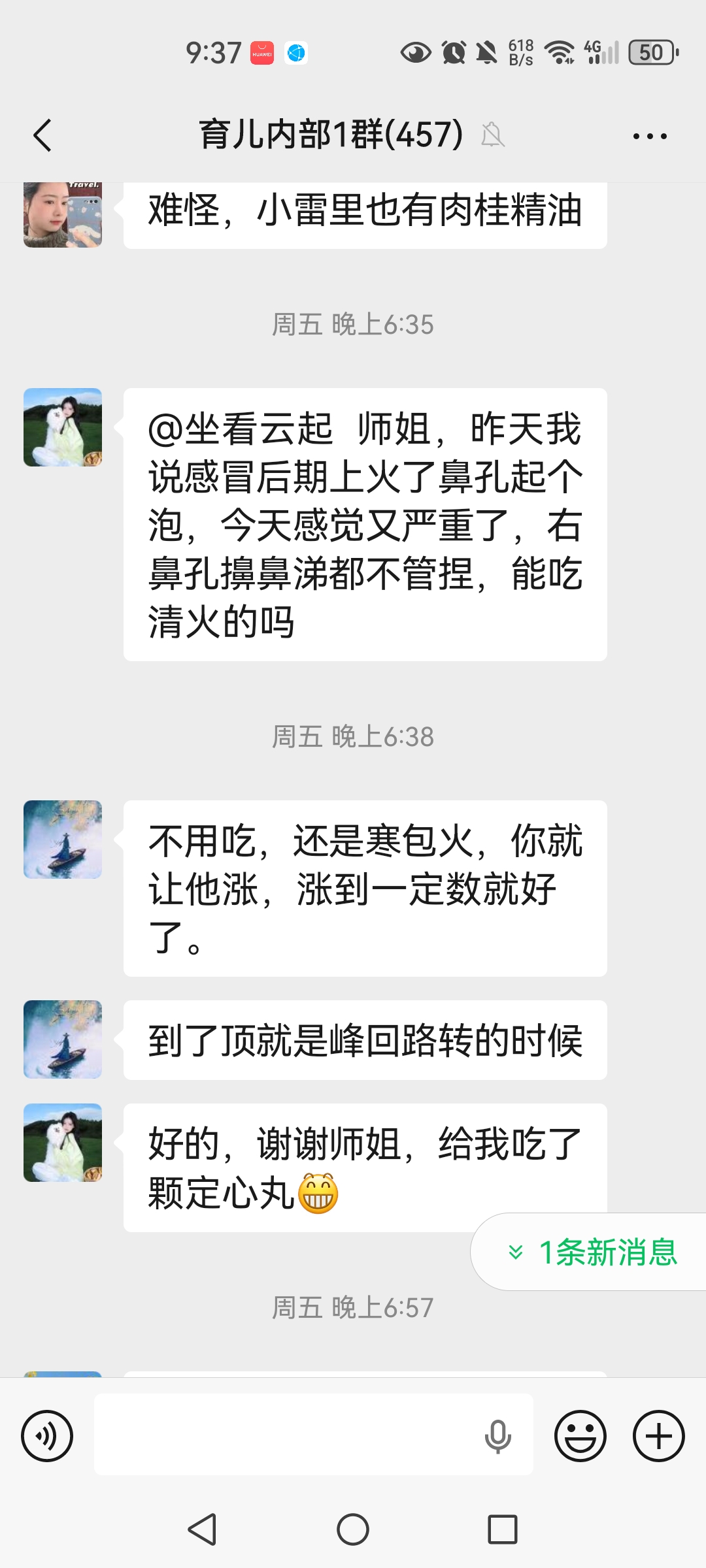 太感谢你了师姐,反复读了两遍,我要把你的话收藏👍❤️。我之前感冒从来没出现过这样的情况,又是上火又是额窦发炎的,而且还和孩子同时感冒,一岁小孩儿都比我好得快😂。记忆中感冒都没有这么长时间过,期间属实有点慌了,是师姐们给了我定心丸!以前都是吃西药,有时候吃两天会不管用然后又继续包药吃😂,现在听你说了这么多,仿佛打开了新世界的大门,拓宽了自己的认知边界!
