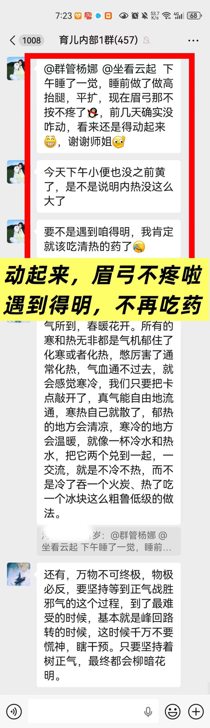 @群管杨娜 @坐看云起 下午睡了一觉,睡前做了做高抬腿,平扩,现在眉弓那不按不疼了[跳跳],前几天确实没咋动,看来还是得动起来[呲牙],谢谢师姐[嘿哈]