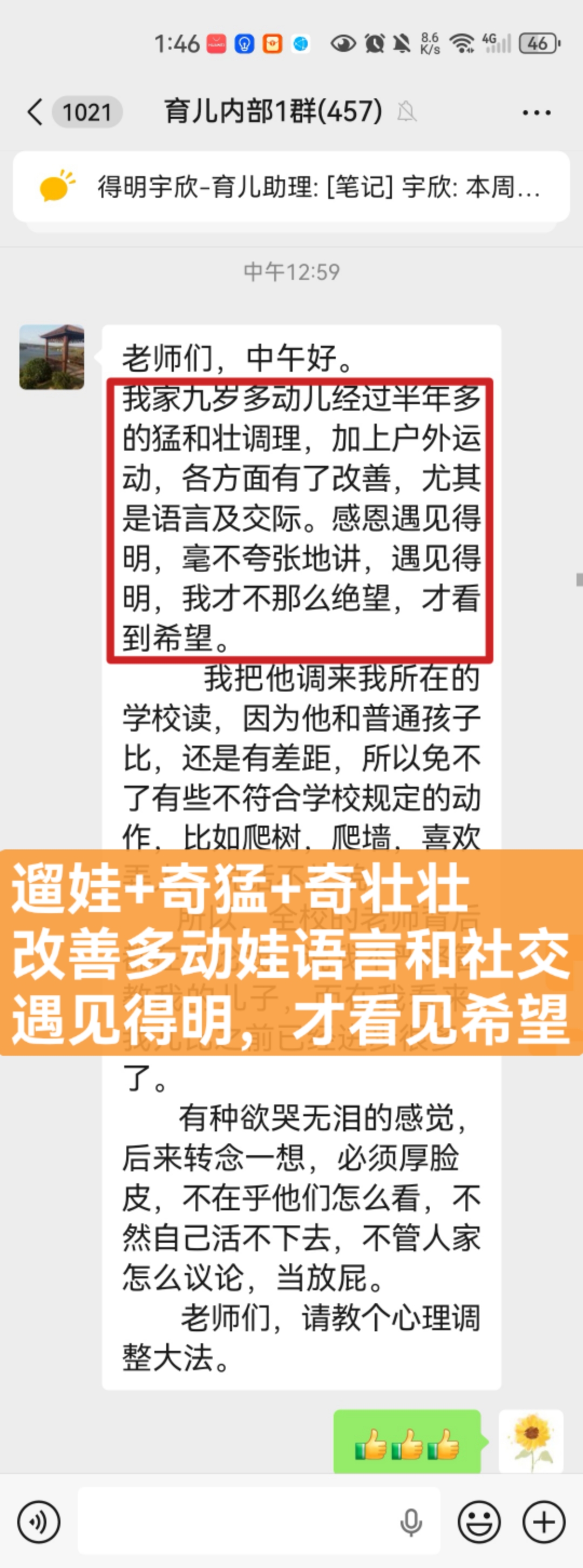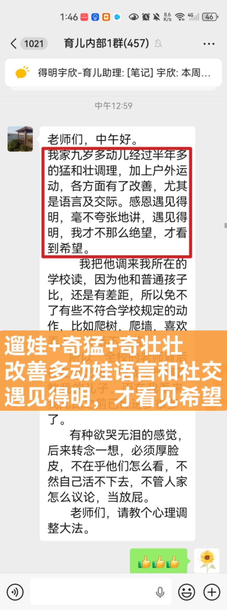 我家九岁多动儿经过半年多的猛和壮调理,加上户外运动,各方面有了改善,尤其是语言及交际。感恩遇见得明,毫不夸张地讲,遇见得明,我才不那么绝望,才看到希望。