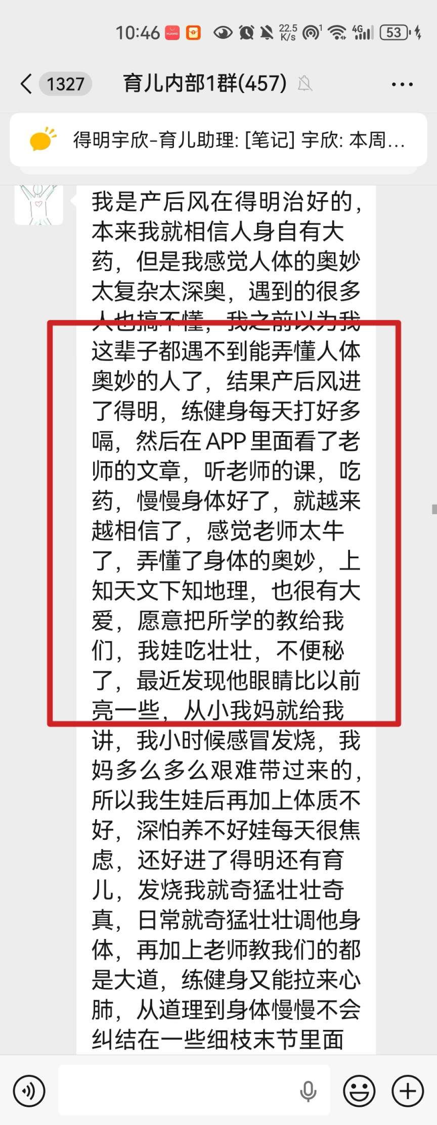 我是产后风在得明治好的,本来我就相信人身自有大药,但是我感觉人体的奥妙太复杂太深奥,遇到的很多人也搞不懂,我之前以为我这辈子都遇不到能弄懂人体奥妙的人了,结果产后风进了得明,练健身每天打好多嗝,然后在APP里面看了老师的文章,听老师的课,吃药,慢慢身体好了,就越来越相信了,感觉老师太牛了,弄懂了身体的奥妙,上知天文下知地理,也很有大爱,愿意把所学的教给我们,我娃吃壮壮,不便秘了,最近发现他眼睛比以前亮一些,从小我妈就给我讲,我小时候感冒发烧,我妈多么多么艰难带过来的,所以我生娃后再加上体质不好,深怕养不好娃每天很焦虑,还好进了得明还有育儿,发烧我就奇猛壮壮奇真,日常就奇猛壮壮调他身体,再加上老师教我们的都是大道,练健身又能拉来心肺,从道理到身体慢慢不会纠结在一些细枝末节里面了。