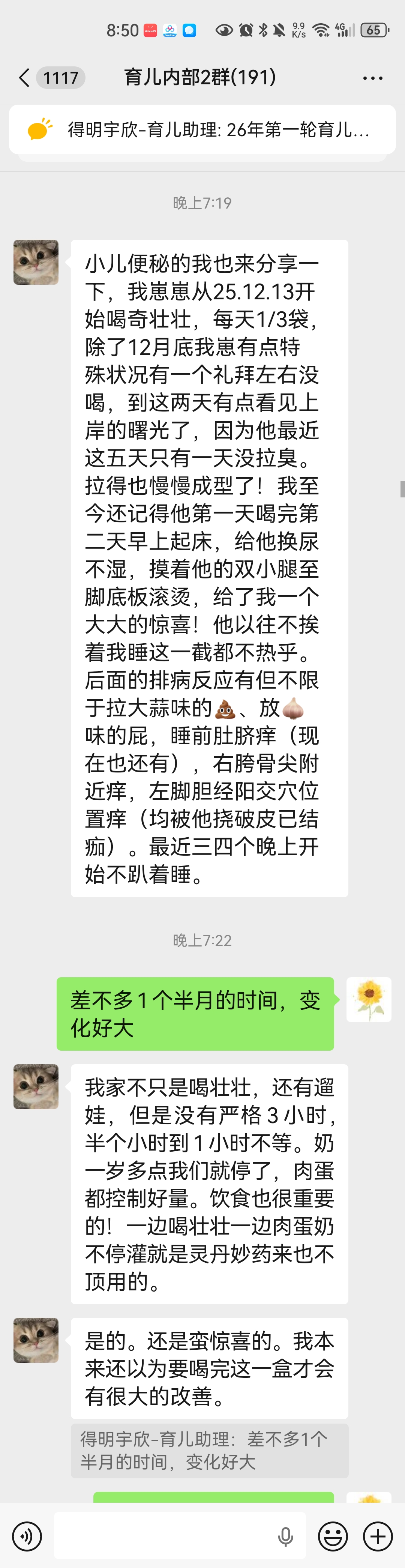 小儿便秘的我也来分享一下,我崽崽从25.12.13开始喝奇壮壮,每天1/3袋,除了12月底我崽有点特殊状况有一个礼拜左右没喝,到这两天有点看见上岸的曙光了,因为他最近这五天只有一天没拉臭。拉得也慢慢成型了!我至今还记得他第一天喝完第二天早上起床,给他换尿不湿,摸着他的双小腿至脚底板滚烫,给了我一个大大的惊喜!他以往不挨着我睡这一截都不热乎。后面的排病反应有但不限于拉大蒜味的💩、放🧄味的屁,睡前肚脐痒(现在也还有),右胯骨尖附近痒,左脚胆经阳交穴位置痒(均被他挠破皮已结痂)。最近三四个晚上开始不趴着睡。
