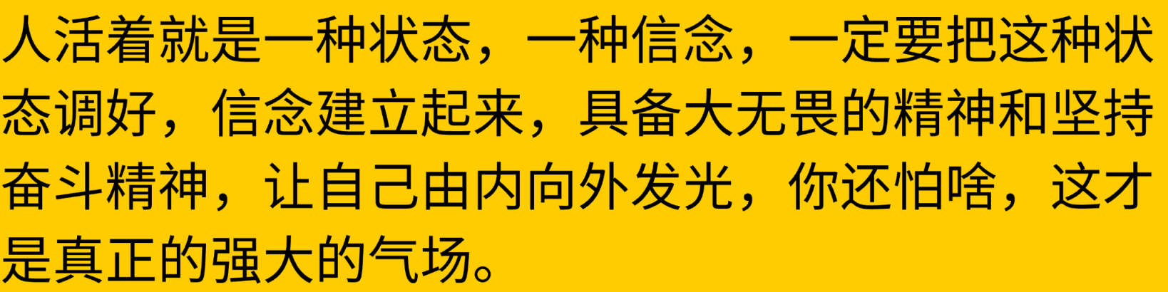 师:人活着就是一种状态,一种信念。一定要把这种状态调好,信念建立起来,具备大无畏的精神和坚持奋斗精神,让自己由内向外发光。你还怕啥?这才是真正的强大的气场。