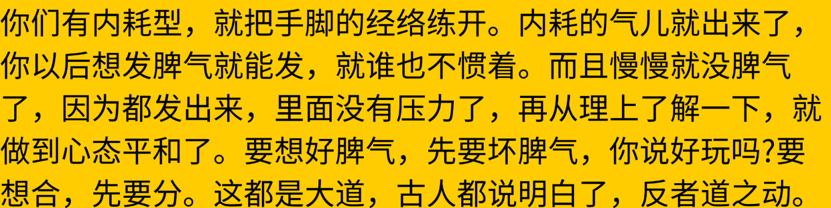 而且慢慢就没脾气了,因为都发出来,里面没有压力了,再从理上了解一下,就做到心态平和了。
