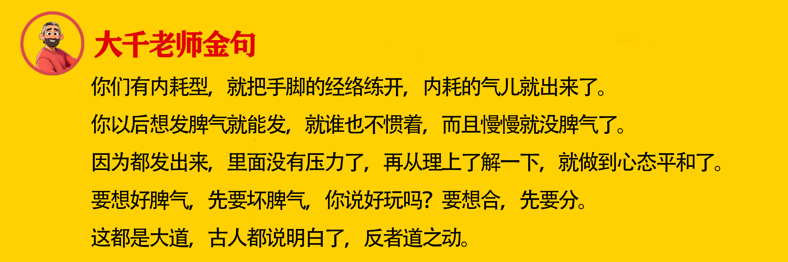 【大千老师金句】你们有内耗型,就把手脚的经络练开,内耗的气儿就出来了 https://dmjs.info/m/dv_topic/view.asp?id=12109535