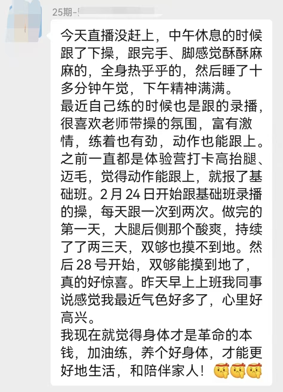 - 大腿后侧酸痛→逐步适应,双够从摸不到地到轻松触地 - 气色肉眼可见变好,被同事夸状态在线 - 跟练后浑身发热,午休后精力拉满,更懂珍惜身体的重要性 继续加油,养好身体才能好好陪伴家人💪