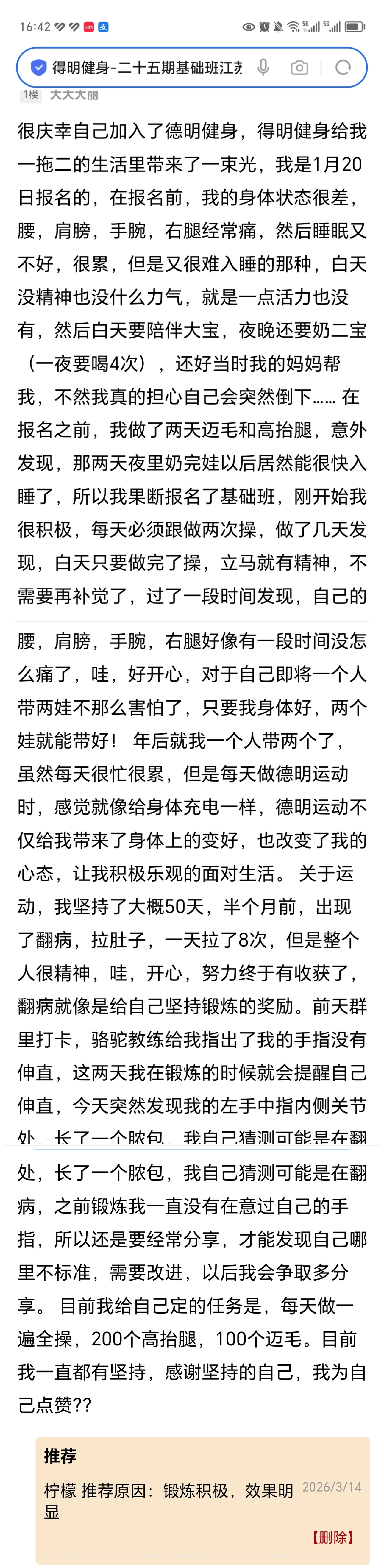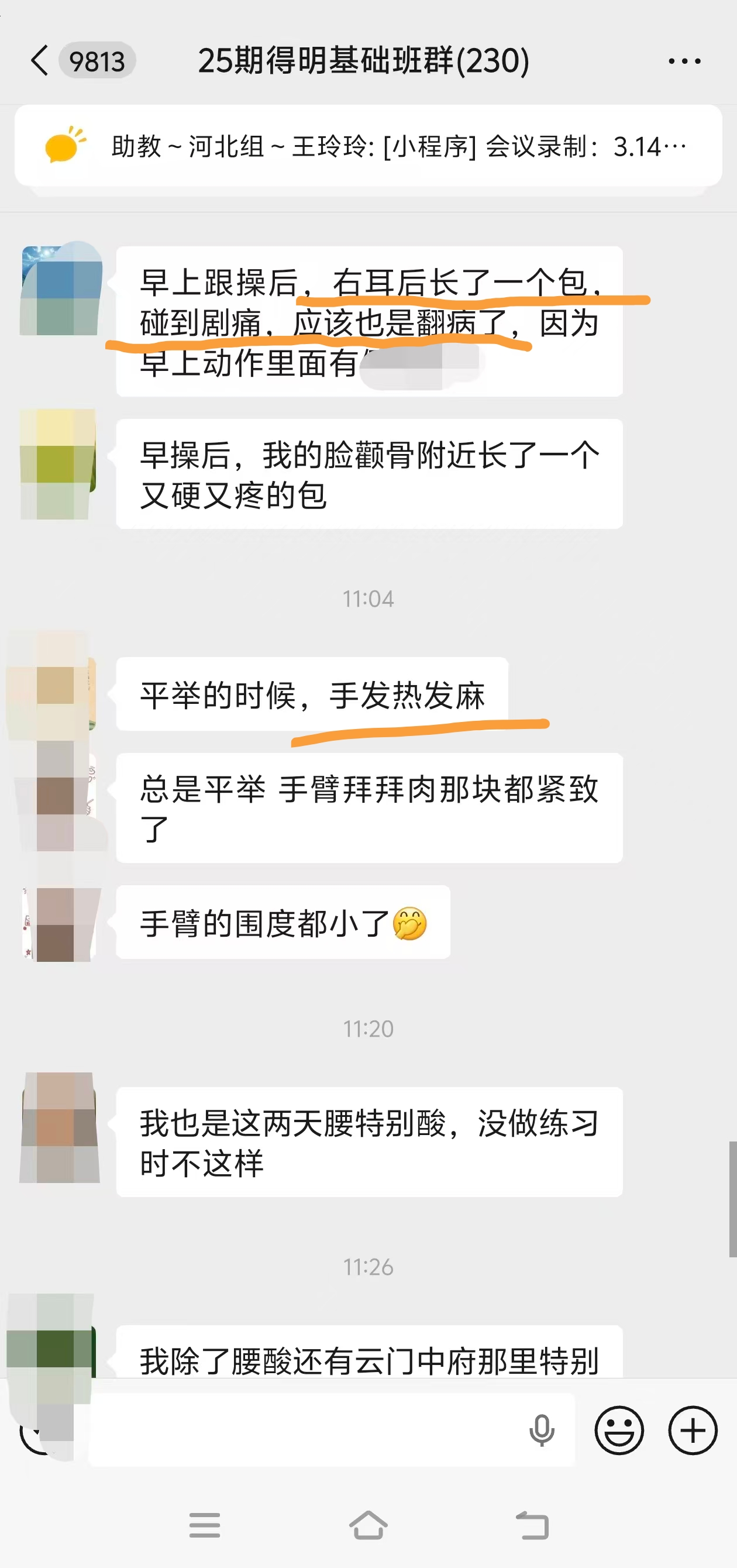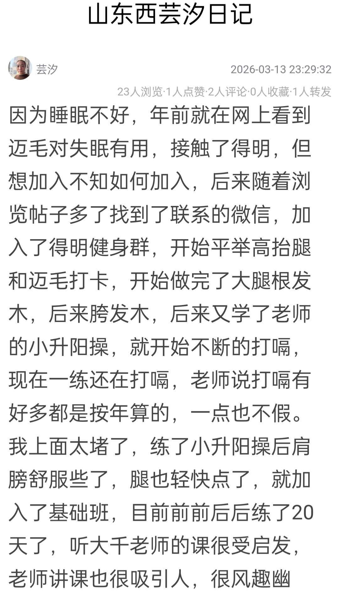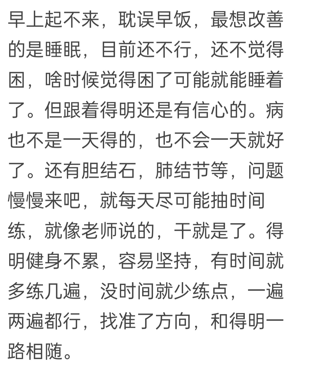 因为睡眠不好,年前就在网上看到迈毛对失眠有用,接触了得明,但想加入不知如何加入,后来随着浏览帖子多了找到了联系的微信,加入了得明健身群,开始平举高抬腿和迈毛打卡,开始做完了大腿根发木,后来胯发木,后来又学了老师的小升阳操,就开始不断的打嗝,现在一练还在打嗝,老师说打嗝有好多都是按年算的,一点也不假。我上面太堵了,练了小升阳操后肩膀舒服些了,腿也轻快点了,就加入了基础班,目前前前后后练了20天了,听大千老师的课很受启发,老师讲课也很吸引人,很风趣幽默,深入浅出不枯燥,很喜欢听老师的课。大千老师带操的时候就像上理论课,能讲清楚要点,跟练效果就很好。老师知识渊博,又很平易近人。老师的徒弟都很像他,真是有什么师傅就有什么徒弟,总之,得明这个大家庭很好,很温馨。我们的组长足下生老师也很负责很有耐心很专业。春春教练和许医师感觉都好厉害,讲的可好了。我以前大便不成形,现在成型了,鼻炎很严重,现在竟然也改善了,以前不觉得饿,现在竟然也会觉得饿了。我有好多习惯不太好,需要改,特别是晚上睡不着,睡的晚,早上起不来,耽误早饭,最想改善的是睡眠,目前还不行,还不觉得困,啥时候觉得困了可能就能睡着了。但跟着得明还是有信心的。病也不是一天得的,也不会一天就好了。还有胆结石,肺结节等,问题慢慢来吧,就每天尽可能抽时间练,就像老师说的,干就是了。得明健身不累,容易坚持,有时间就多练几遍,没时间就少练点,一遍两遍都行,找准了方向,和得明一路相随。