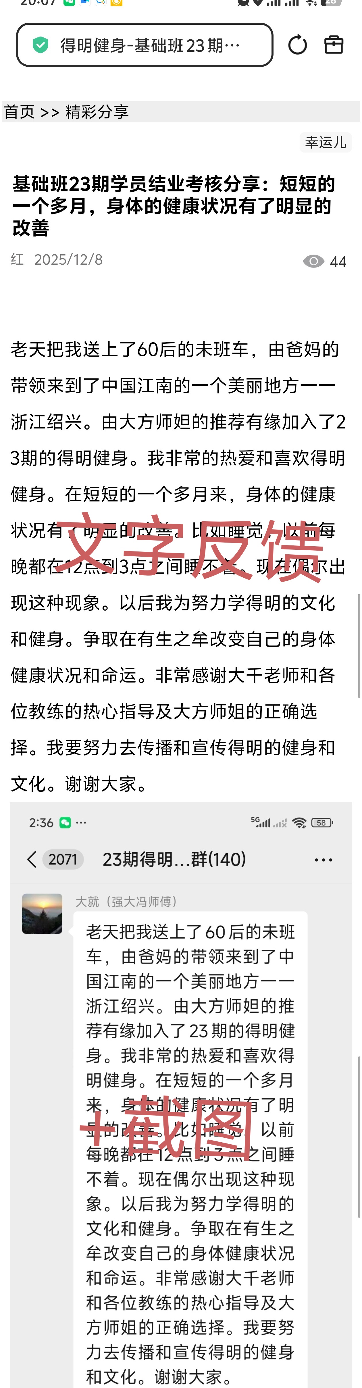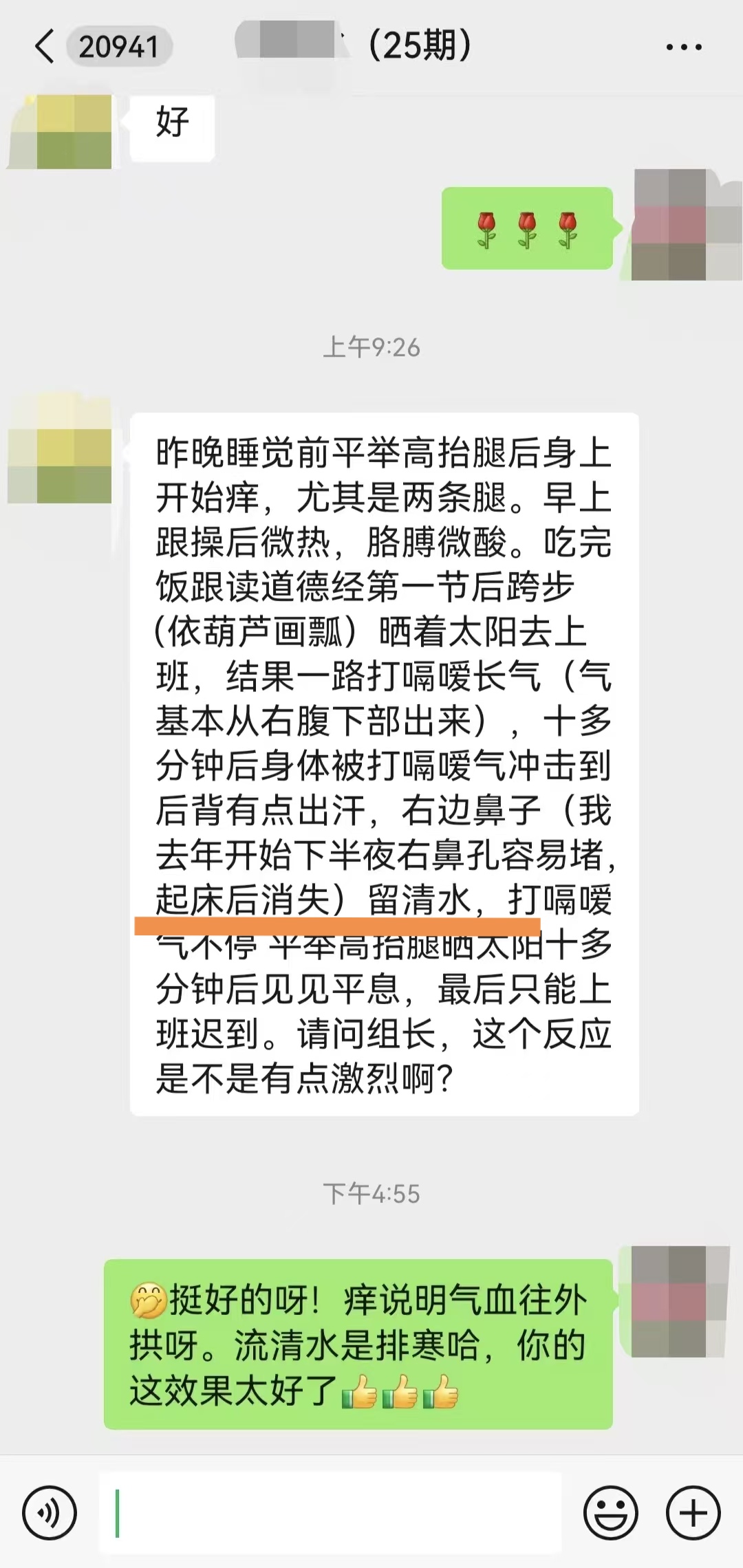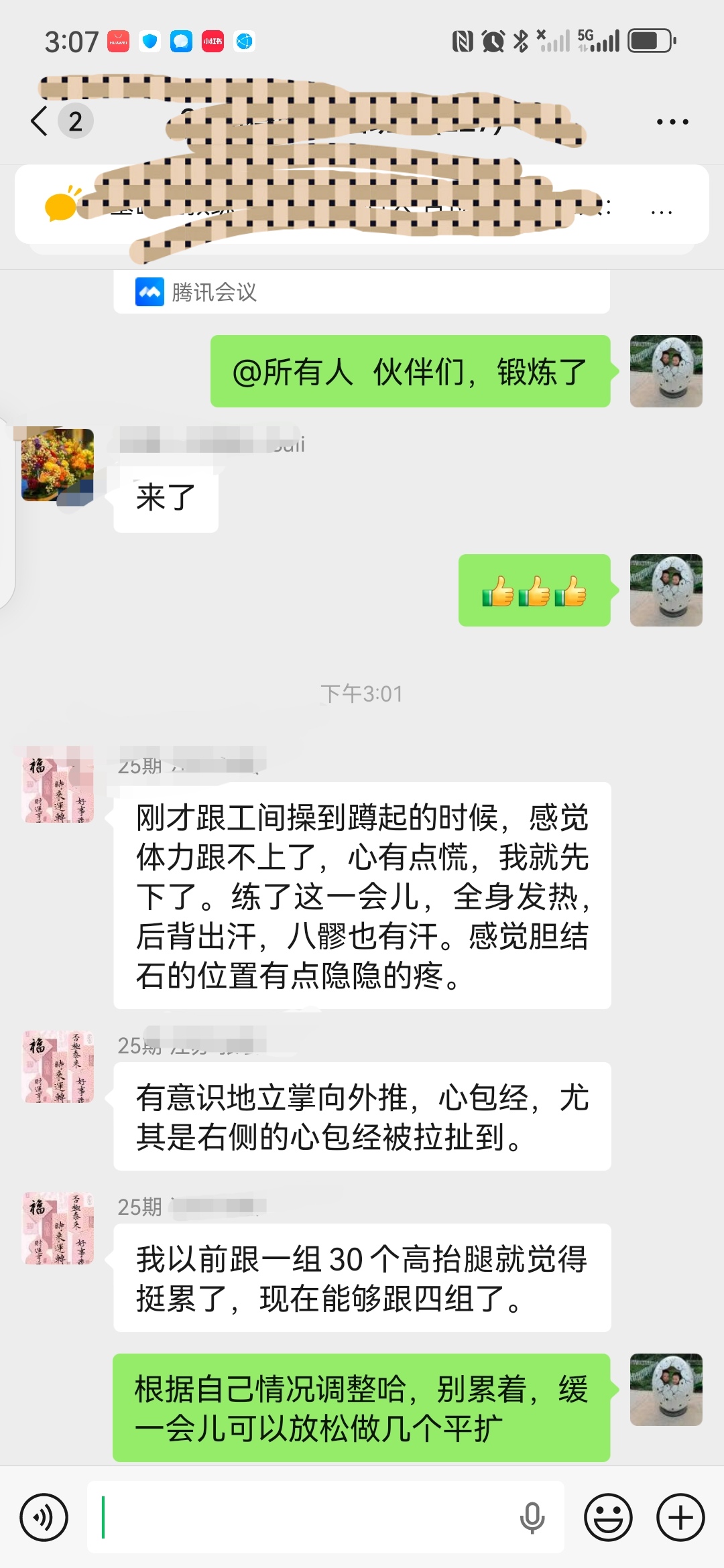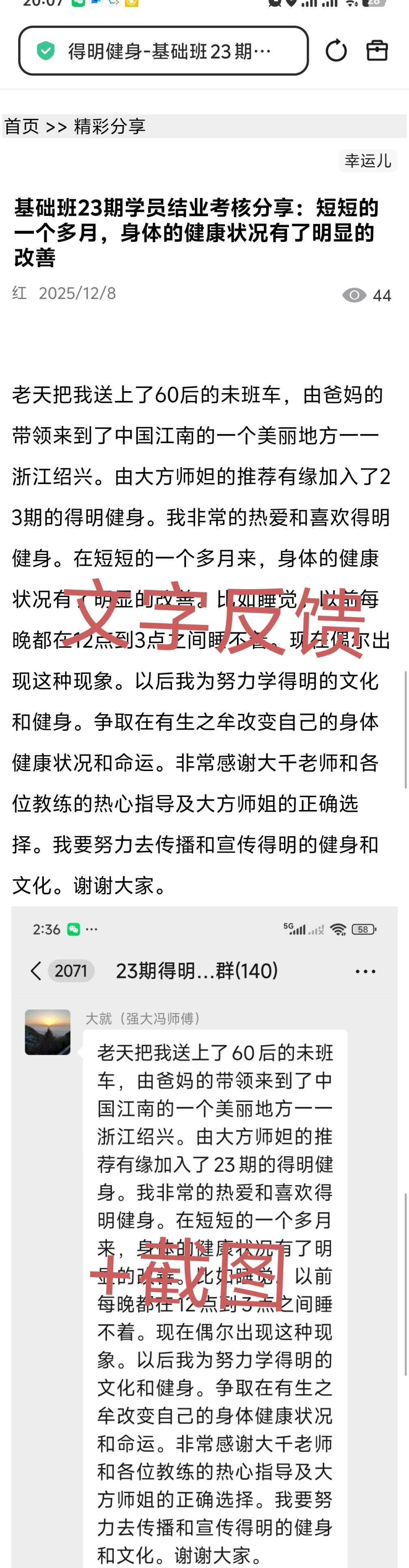 因为睡眠不好,年前就在网上看到迈毛对失眠有用,接触了得明,但想加入不知如何加入,后来随着浏览帖子多了找到了联系的微信,加入了得明健身群,开始平举高抬腿和迈毛打卡,开始做完了大腿根发木,后来胯发木,后来又学了老师的小升阳操,就开始不断的打嗝,现在一练还在打嗝,老师说打嗝有好多都是按年算的,一点也不假。我上面太堵了,练了小升阳操后肩膀舒服些了,腿也轻快点了,就加入了基础班,目前前前后后练了20天了,听大千老师的课很受启发,老师讲课也很吸引人,很风趣幽默,深入浅出不枯燥,很喜欢听老师的课。大千老师带操的时候就像上理论课,能讲清楚要点,跟练效果就很好。老师知识渊博,又很平易近人。老师的徒弟都很像他,真是有什么师傅就有什么徒弟,总之,得明这个大家庭很好,很温馨。我们的组长足下生老师也很负责很有耐心很专业。春春教练和许医师感觉都好厉害,讲的可好了。我以前大便不成形,现在成型了,鼻炎很严重,现在竟然也改善了,以前不觉得饿,现在竟然也会觉得饿了。我有好多习惯不太好,需要改,特别是晚上睡不着,睡的晚,早上起不来,耽误早饭,最想改善的是睡眠,目前还不行,还不觉得困,啥时候觉得困了可能就能睡着了。但跟着得明还是有信心的。病也不是一天得的,也不会一天就好了。还有胆结石,肺结节等,问题慢慢来吧,就每天尽可能抽时间练,就像老师说的,干就是了。得明健身不累,容易坚持,有时间就多练几遍,没时间就少练点,一遍两遍都行,找准了方向,和得明一路相随。