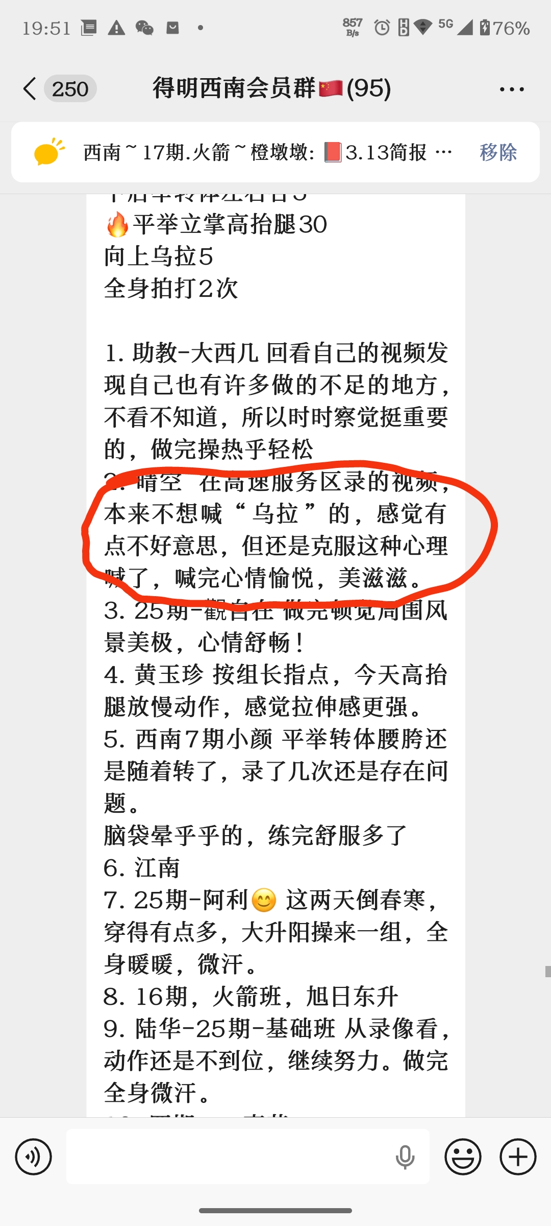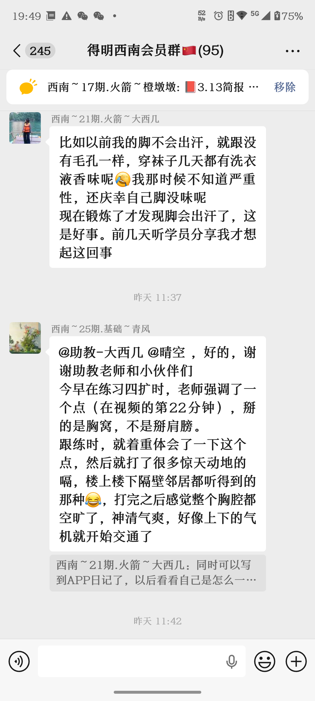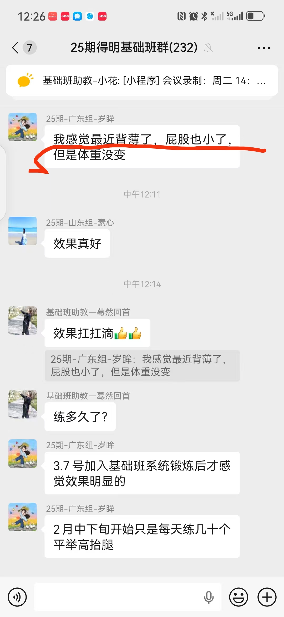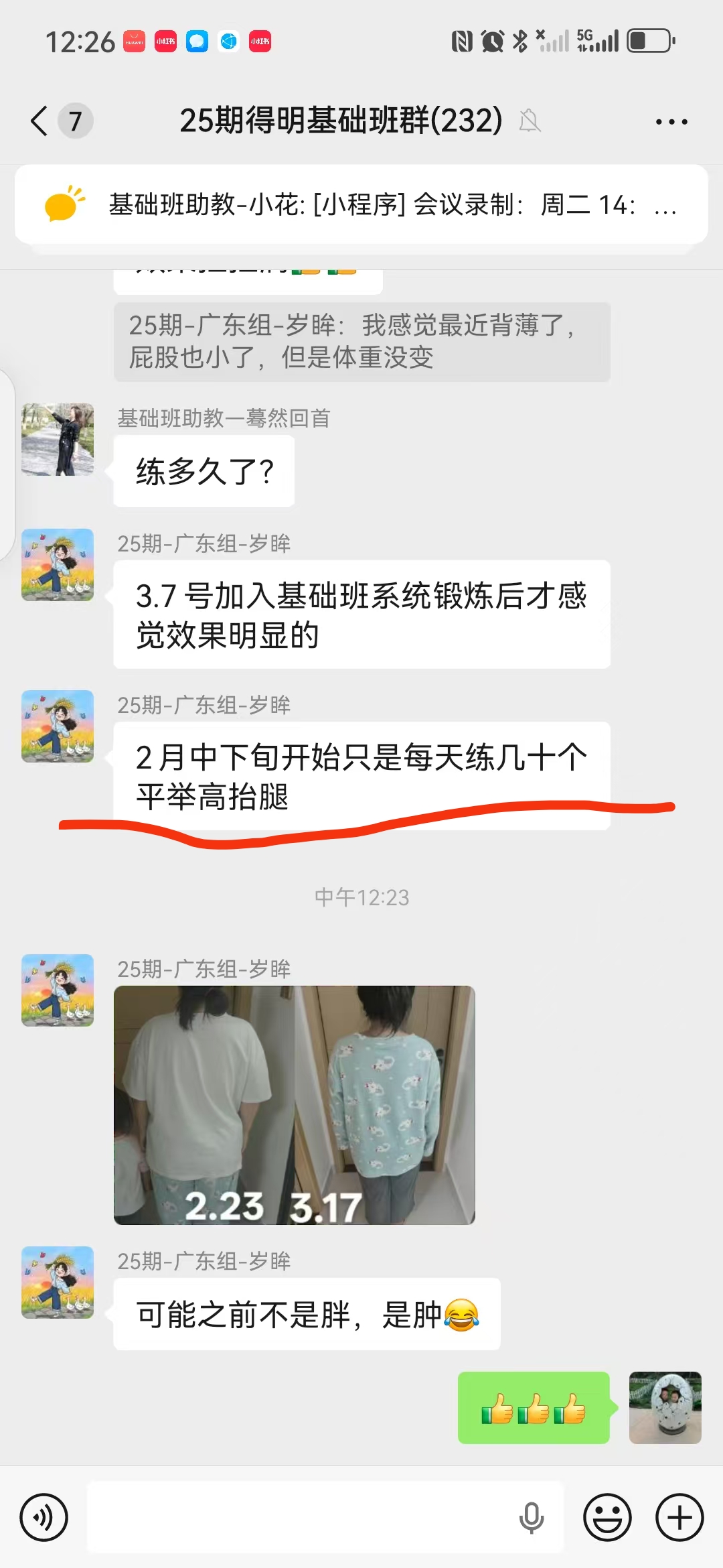 因为睡眠不好,年前就在网上看到迈毛对失眠有用,接触了得明,但想加入不知如何加入,后来随着浏览帖子多了找到了联系的微信,加入了得明健身群,开始平举高抬腿和迈毛打卡,开始做完了大腿根发木,后来胯发木,后来又学了老师的小升阳操,就开始不断的打嗝,现在一练还在打嗝,老师说打嗝有好多都是按年算的,一点也不假。我上面太堵了,练了小升阳操后肩膀舒服些了,腿也轻快点了,就加入了基础班,目前前前后后练了20天了,听大千老师的课很受启发,老师讲课也很吸引人,很风趣幽默,深入浅出不枯燥,很喜欢听老师的课。大千老师带操的时候就像上理论课,能讲清楚要点,跟练效果就很好。老师知识渊博,又很平易近人。老师的徒弟都很像他,真是有什么师傅就有什么徒弟,总之,得明这个大家庭很好,很温馨。我们的组长足下生老师也很负责很有耐心很专业。春春教练和许医师感觉都好厉害,讲的可好了。我以前大便不成形,现在成型了,鼻炎很严重,现在竟然也改善了,以前不觉得饿,现在竟然也会觉得饿了。我有好多习惯不太好,需要改,特别是晚上睡不着,睡的晚,早上起不来,耽误早饭,最想改善的是睡眠,目前还不行,还不觉得困,啥时候觉得困了可能就能睡着了。但跟着得明还是有信心的。病也不是一天得的,也不会一天就好了。还有胆结石,肺结节等,问题慢慢来吧,就每天尽可能抽时间练,就像老师说的,干就是了。得明健身不累,容易坚持,有时间就多练几遍,没时间就少练点,一遍两遍都行,找准了方向,和得明一路相随。