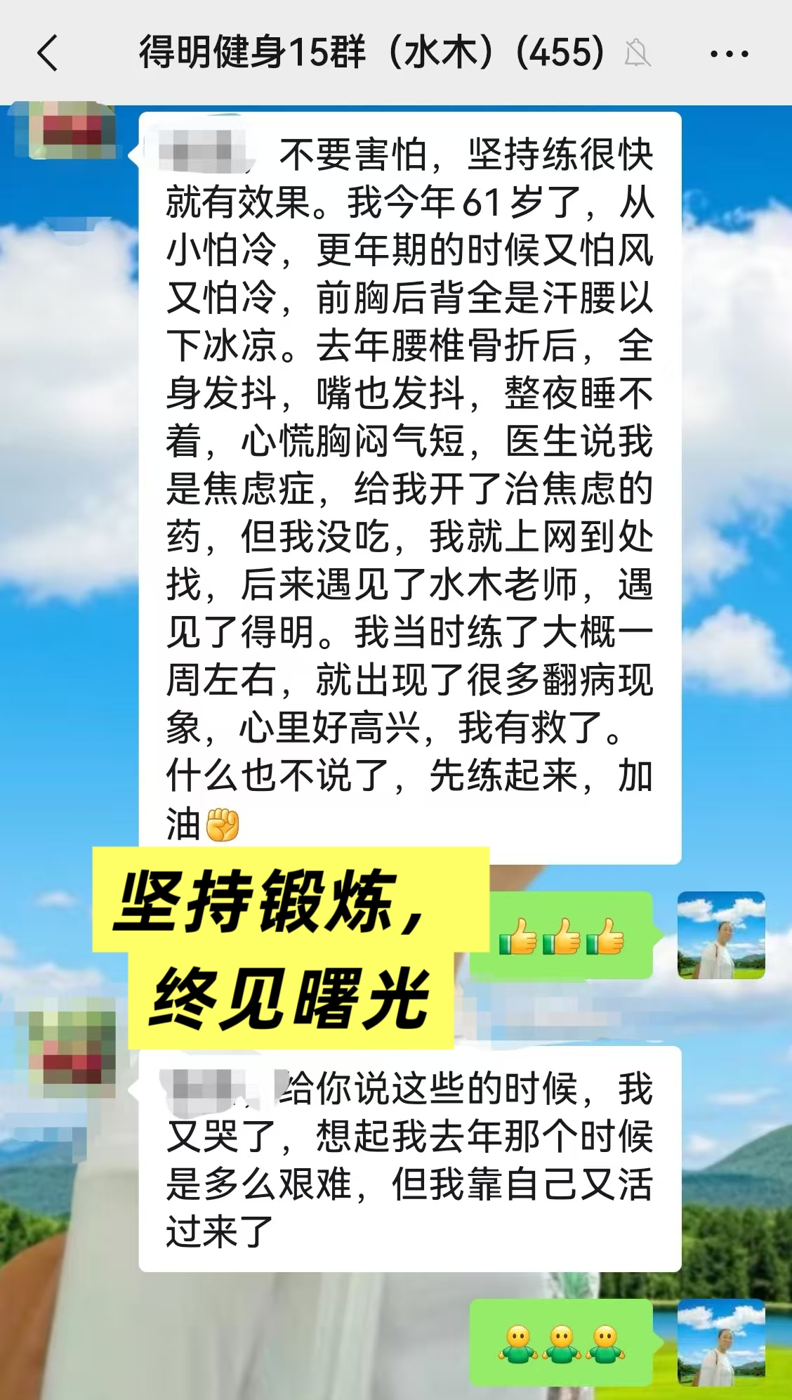 不要害怕,坚持练很快就有效果。我今年61岁了,从小怕冷,更年期的时候又怕风又怕冷,前胸后背全是汗腰以下冰凉。去年腰椎骨折后,全身发抖,嘴也发抖,整夜睡不着,心慌胸闷气短,医生说我是焦虑症,给我开了治焦虑的药,但我没吃,我就上网到处找,后来遇见了水木老师,遇见了得明。我当时练了大概一周左右,就出现了很多翻病现象,心里好高兴,我有救了。什么也不说了,先练起来,加油!给你说这些的时候,我又哭了,想起我去年那个时候是多么艰难,但我靠自己又活过来了