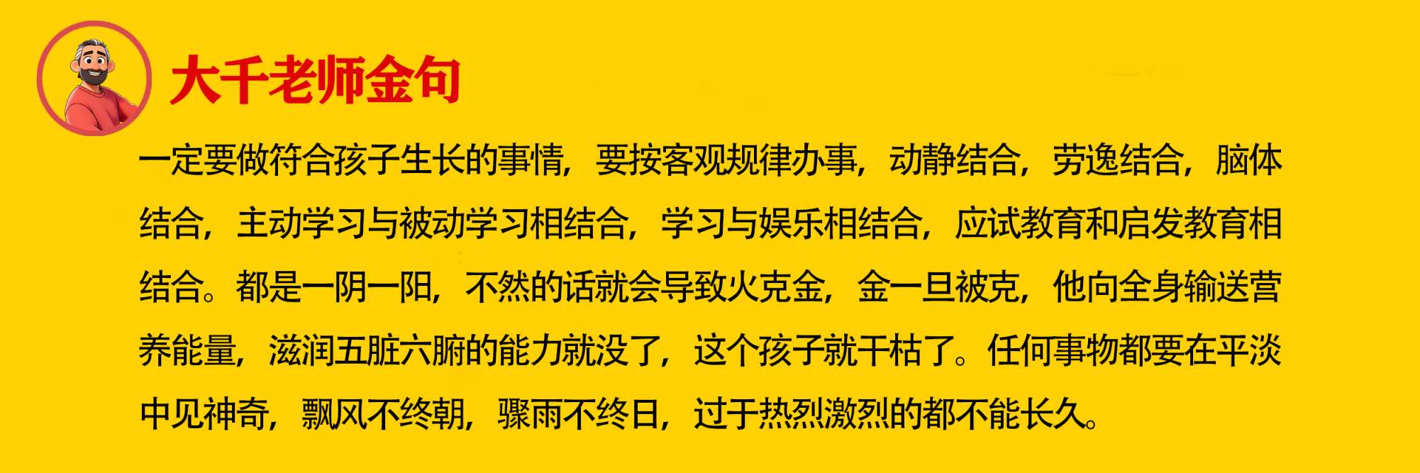 【大千老师金句】一定要做符合孩子生长的事情,要按客观规律办事,动静结合,劳逸结合,脑体结合,主动学习与被动学习相结合,学习与娱乐相结合,应试教育和启发教育相结合。都是一阴一阳,不然的话就会导致火克金,金一旦被克,他向全身输送营养能量,滋润五脏六腑的能力就没了,这个孩子就干枯了。任何事物都要在平淡中见神奇,飘风不终朝,骤雨不终日,过于热烈激烈的都不能长久。 https://dmjs.info/m/dv_topic/view.asp?id=12782610