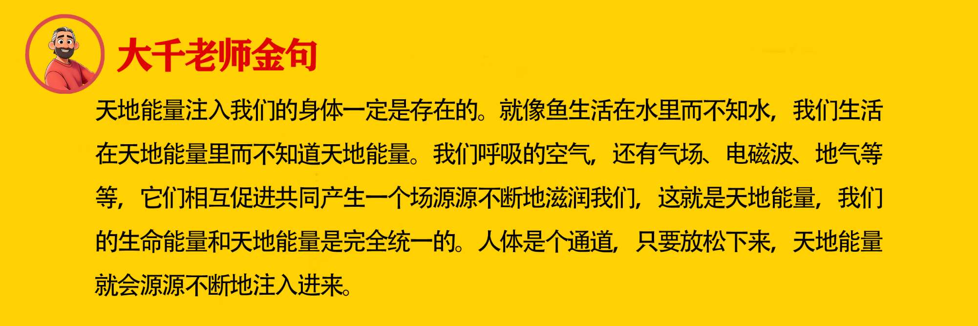 天地能量注入我们的身体一定是存在的。就像鱼生活在水里而不知水,我们生活在天地能量里而不知道天地能量。我们呼吸的空气,还有气场、电磁波、地气等等,它们相互促进共同产生一个场源源不断地滋润我们,这就是天地能量,我们的生命能量和天地能量是完全统一的。人体是个通道,只要放松下来,天地能量就会源源不断地注入进来。