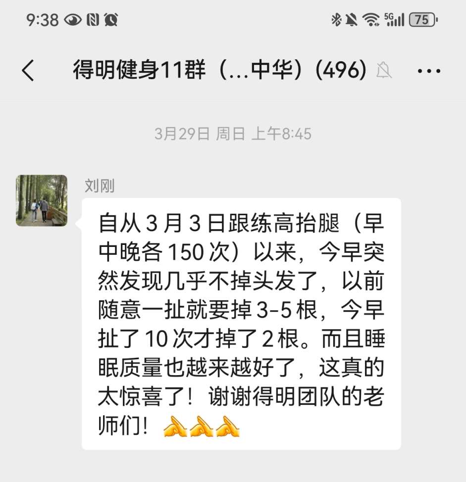 自从3月3日跟练高抬腿(早中晚各150次)以来,今早突然发现几乎不掉头发了,以前随意一扯就要掉3-5根,今早扯了10次才掉了2根。而且睡眠质量也越来越好了,这真的太惊喜了!谢谢得明团队的老师们!