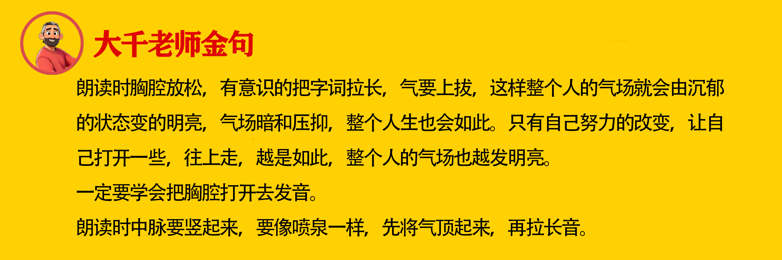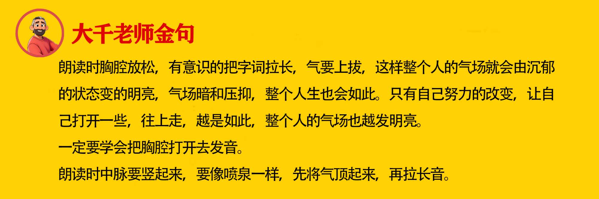 一定要学会把胸腔打开去发音。 朗读时中脉要竖起来,要像喷泉一样,先将气顶起来,再拉长音。 原文链接:大千老师讲朗读 https://dmjs.info/m/dv_topic/view.asp?id=1521529 查看得明学习引导>>