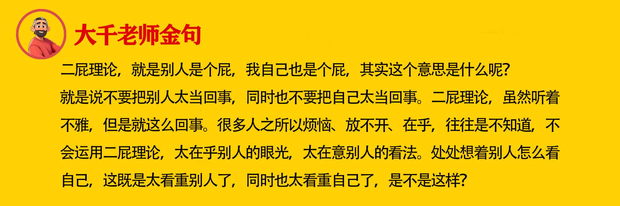 【大千老师金句】二屁理论,就是别人是个屁,我自己也是个屁,其实这个意思是什么呢?就是说不要把别人太当回事,同时也不要把自己太当回事 https://dmjs.info/m/dv_topic/view.asp?id=13127503