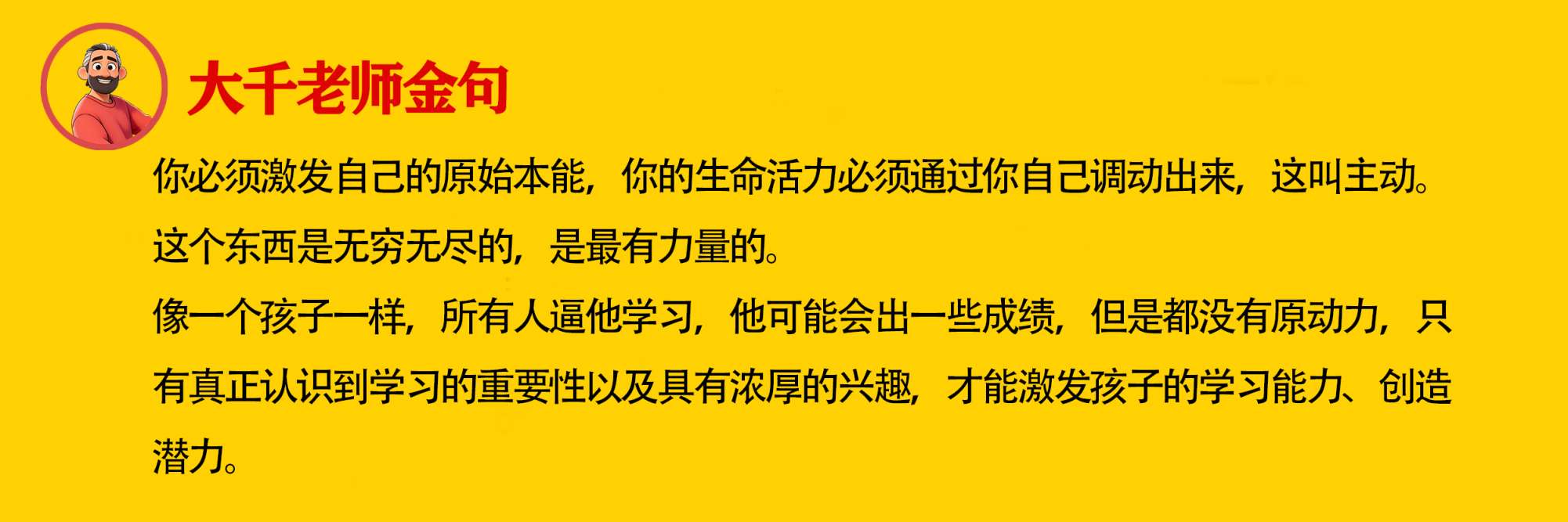 像一个孩子一样,所有人逼他学习,他可能会出一些成绩,但是都没有原动力,只有真正认识到学习的重要性以及具有浓厚的兴趣,才能激发孩子的学习能力、创造潜力。