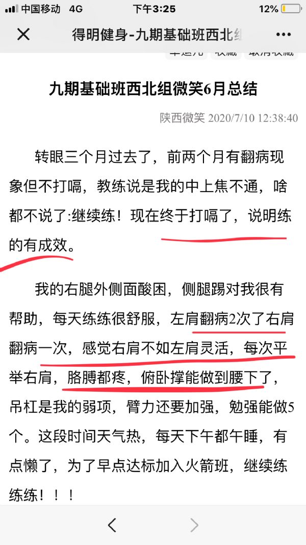 我的右腿外侧面酸困,侧腿踢对我很有帮助,每天练练很舒服,左肩翻病2次了右肩翻病一次,感觉右肩不如左肩灵活,每次平举右肩,胳膊都疼,俯卧撑能做到腰下了,吊杠是我的弱项,臂力还要加强,勉强能做5个。这段时间天气热,每天下午都午睡,有点懒了,为了早点达标加入火箭班,继续练练练!!! 查看得明学习引导>>