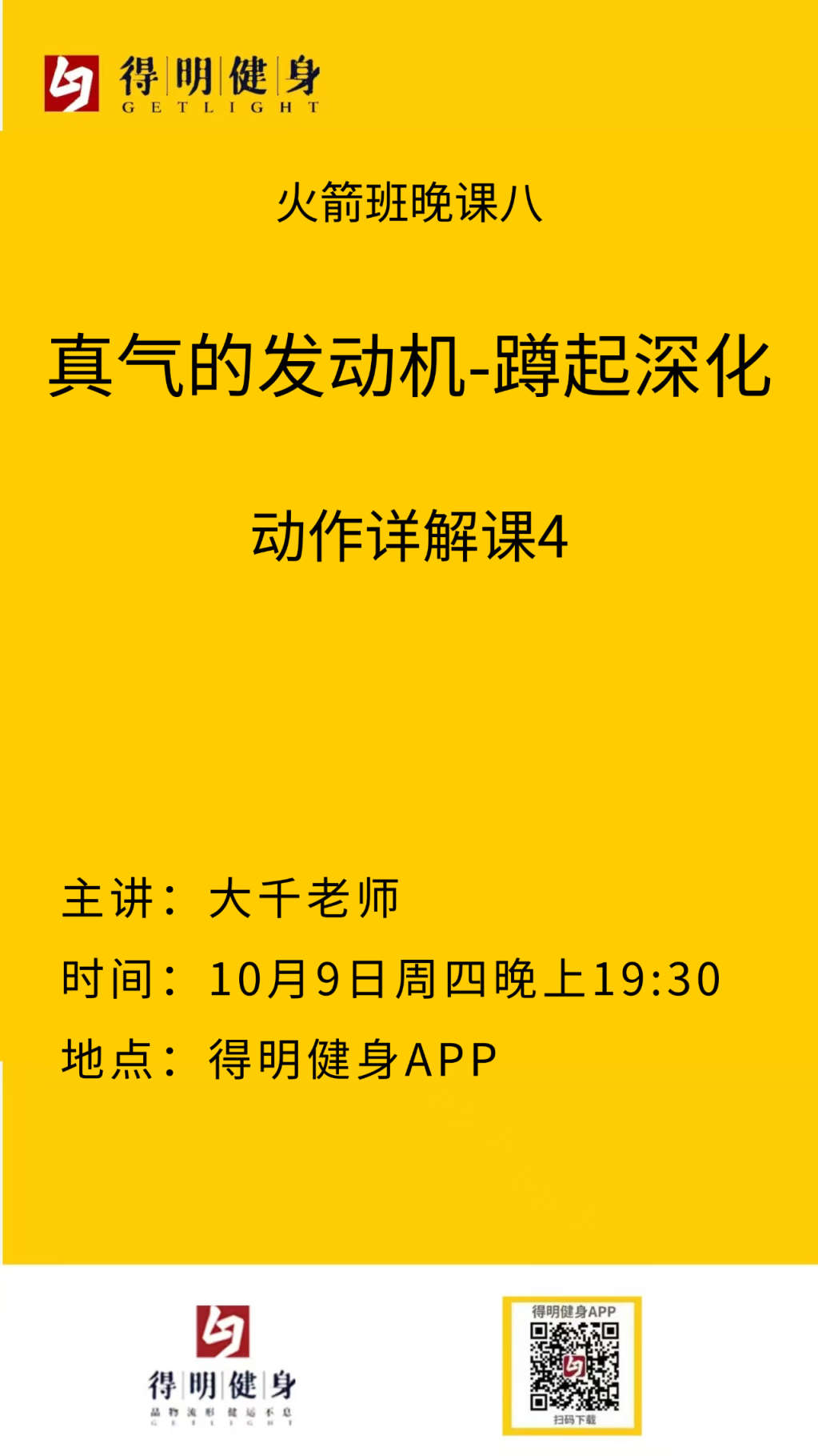 火箭班晚课第八节课:蹲起深化-真气的发动机,(动作详解课4)伙伴们快快跟上来!10月9日周四晚上19:30得明健身APP我们不见不散!