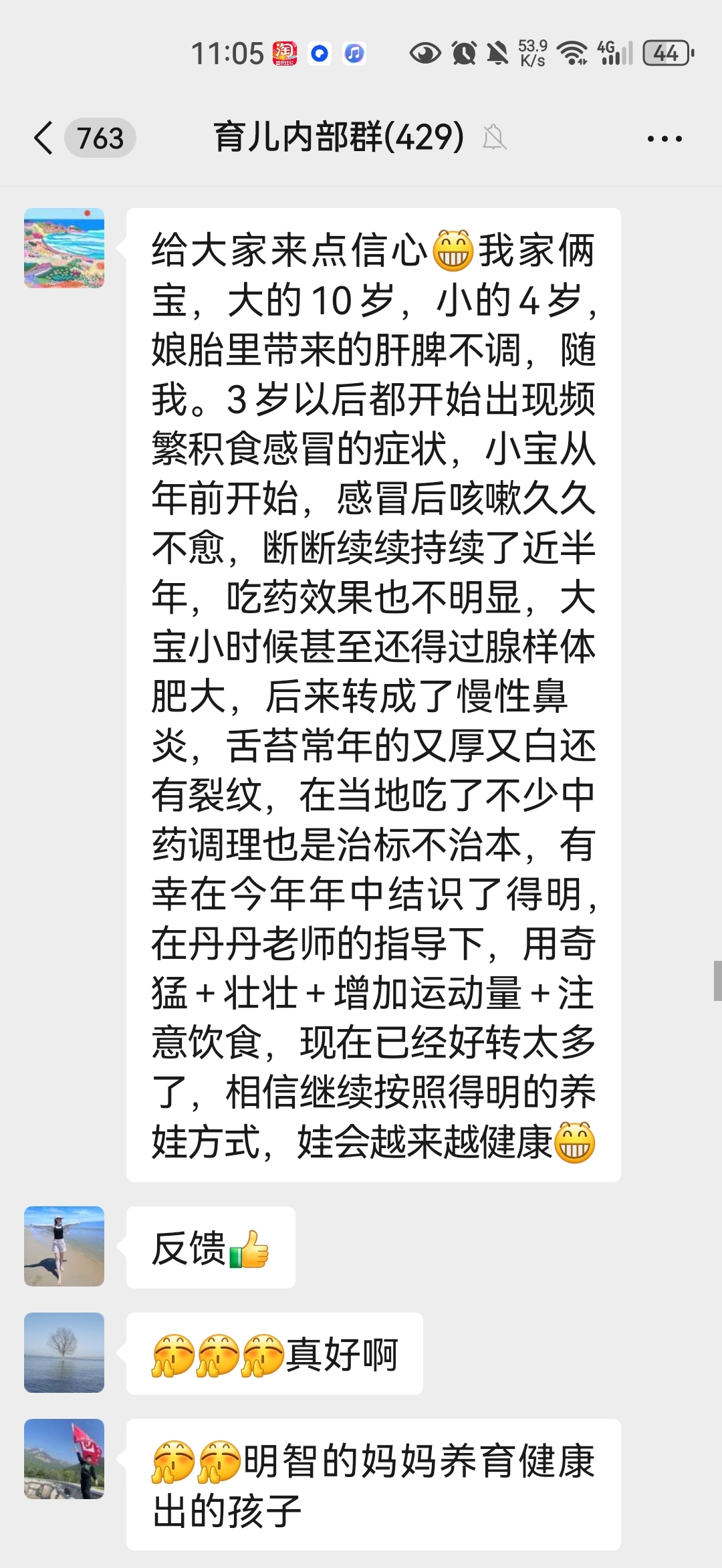给大家来点信心[呲牙]我家俩宝,大的10岁,小的4岁,娘胎里带来的肝脾不调,随我。3岁以后都开始出现频繁积食感冒的症状,小宝从年前开始,感冒后咳嗽久久不愈,断断续续持续了近半年,吃药效果也不明显,大宝小时候甚至还得过腺样体肥大,后来转成了慢性鼻炎,舌苔常年的又厚又白还有裂纹,在当地吃了不少中药调理也是治标不治本,有幸在今年年中结识了得明,在丹丹老师的指导下,用奇猛+壮壮+增加运动量+注意饮食,现在已经好转太多了,相信继续按照得明的养娃方式,娃会越来越健康[呲牙]