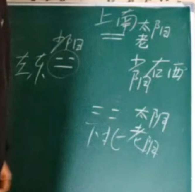 6.古人认为上是南,下是北,左东,右西跟现在的地图正好是相反的,下北极寒之地就是老阴,上南是极阳之地就是老阳。如同水蒸气一热就往上走,遇冷就凝结就往下走。越往南方走越阳,越热,越往北方走越寒,越阴。