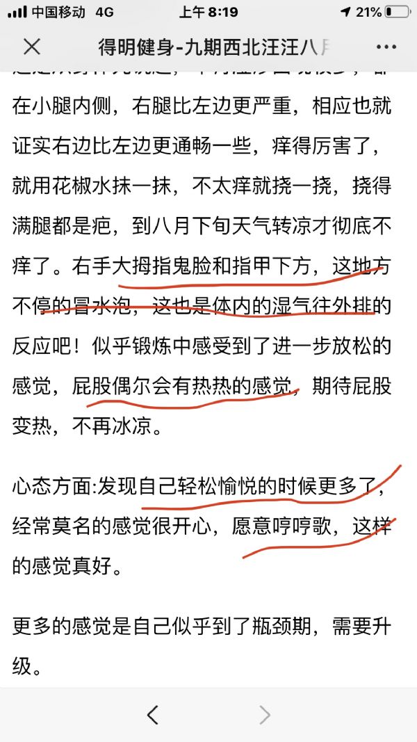 还是从身体先说起,本月湿疹出现较多,都在小腿内侧,右腿比左边更严重,相应也就证实右边比左边更通畅一些,痒得厉害了,就用花椒水抹一抹,不太痒就挠一挠,挠得满腿都是疤,到八月下旬天气转凉才彻底不痒了。右手大拇指鬼脸和指甲下方,这地方不停的冒水泡,这也是体内的湿气往外排的反应吧!似乎锻炼中感受到了进一步放松的感觉,屁股偶尔会有热热的感觉,期待屁股变热,不再冰凉。