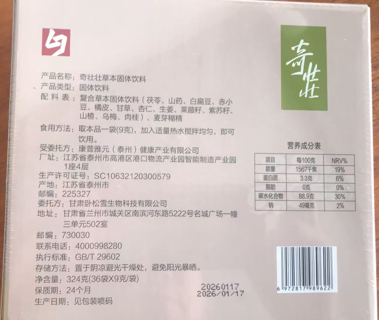 配料表:茯苓、山药、白扁豆、赤小豆、橘皮、甘草、杏仁、生姜、莱菔子、紫苏子、山楂、乌梅、肉桂、麦芽糊精(生产辅助剂) 适宜人群:1岁以上孩子和成人,具体用量请咨询助理:dqzhuli1 dqzhuli3。 食用方法:加入适量热水,搅拌均匀,即可饮用。 配合奇家其他食疗品,需减半。 推荐用量: 1、儿童,25公斤内,三分之一袋起,可逐步加至半袋。 50公斤内,半袋起,可逐步加至一袋。 2、成人,初次服用者,建议每日饮用一袋,身体虚弱者可先每日半袋开始。 具体用量请咨询,食疗助理微信:dqzhuli1 dqzhuli3 奇壮壮是一款立足于调理肝、脾、肺等常见问题为主,特别是中焦脾胃的复合草本植物产品,属于固体饮料类食品。它选用了13味药食同源的食材为原料,尤其适合小孩,以及中焦有问题的成年人。 应对问题 (1.)肠胃问题 ①白天吐奶,晚上闹,可以喝奇壮壮。这是因为小儿主要的问题就是调肠胃,肠胃通畅,百病不生,建议不要喂酸奶和牛奶,会导致肠胃淤滞。 ②孩子吃饭不好,体重也上不来,可以喝奇壮壮。小孩脾胃弱,如果饮食不当容易造成脾胃淤堵损伤,奇壮壮专注于温通调理脾胃,淤滞通开了,胃口自然就好,脾胃运化正常,身体自然强壮。 ③有口臭的,可以试试奇壮壮。口臭是由于肠胃淤滞不通,食饮之气不能有效消化,郁而发臭上泛而成的。奇壮壮是一款调理肠胃为主的产品,肠胃通畅宽阔,人就不会口臭。同理,舌苔厚,便秘也是如此,也可以喝奇壮壮,尤其针对有大肚子淤滞的人。 (2.)皮肤问题 ①食指有白斑等皮肤问题的,可以试试奇壮壮。出现白斑,一般是对应的经络有淤堵,气堵住了过不来,食指对应肠胃,说明堵在肠胃,奇壮壮是一款专注调理脾胃的产品,此时就可以试试奇壮壮。 (3.)性格问题 ①孩子不是很活泼,不爱动,可以试试奇壮壮。中医认为脾主四肢,脾胃结,无力把气血充分的推运到四肢,人就变得多思懒动。奇壮壮通调人体中焦脾胃,脾胃健康、强壮、通顺,就能把气血推运到四肢,让四肢强壮润泽,人自然就能活泼好动起来。 (4.)睡眠问题 ①有失眠问题的,也可以试试奇壮壮。奇壮壮是一款以调理肝、脾、肺等常见问题为主,特别是中焦脾胃的产品。《内经》说,“胃不和则卧不安”,肠胃系统紊乱,能直接影响人的神经,影响人的睡眠。如果有脾胃不调,失眠困扰的,不妨试试奇壮壮。同时,也可以配上奇悦试试。 ②小孩晚上睡觉翻身多,可以试试奇壮壮。翻身多的话,说明肝脾不和,老爱翻身都是肠胃有问题。奇壮壮专门用于调理肠胃。 常见反应 (1.)二便 ①孩子喝了奇壮壮后,前两天有次大便,是很臭的大蒜味,还出痘痘和小便增多。这是喝了奇壮壮后,开始翻病,开始调整大便,出痘痘,还有小便多,这是排水湿之气,下积滞。 ②喝奇壮壮后,大便增多。奇壮壮着重调理中焦,随着中焦通开一些,身体里的淤滞会随着大便排出,大便也就相应增多。 推荐阅读:大千老师聊奇家调理品与保健品 https://dmjs.info/m/dv_topic/view.asp?id=6503740&k=&t=1742536554 附:奇壮壮成分中每味中药材的功能与主治(摘自《2015版中华人民共和国药典》) 茯苓:利水渗湿,健脾,宁心。用于水肿尿少,痰饮眩悸,脾虚食少,便溏泄泻,心神不安,惊悸失眠。 山药:补脾养胃,生津益肺,补肾涩精。用于脾虚食少,久泻不止,肺虚喘咳,肾虚遗精,带下,尿频,虚热消渴。麸炒山药补脾健胃。用于脾虚食少,泄泻便溏,白带过多。 白扁豆:健脾化湿,和中消暑。用于脾胃虚弱,食欲不振,大便溏泻,白带过多,暑湿吐泻,胸闷腹胀。炒白扁豆健脾化湿。用于脾虚泄泻,白带过多。 赤小豆: 利水消肿,解毒排脓。用于水肿胀满,脚气浮肿,黄疸尿赤,风湿热痹,痈肿疮毒,肠痈腹痛。 橘皮/陈皮:理气健脾,燥湿化痰。用于脘腹胀满,食少吐泻,咳嗽痰多。 甘草:补脾益气,清热解毒,祛痰止咳,缓急止痛,调和诸药。用于脾胃虚弱,倦怠乏力,心悸气短,咳嗽痰多,脘腹、四肢挛急疼痛,痈肿疮毒,缓解药物毒性、烈性。 (苦)杏仁:降气止咳平喘,润肠通便。用于咳嗽气喘,胸满痰多,肠燥便秘。 生姜:解表散寒,温中止呕,化痰止咳,解鱼蟹毒。用于风寒感冒,胃寒呕吐,寒痰咳嗽,鱼蟹中毒。 莱菔子:消食除胀,降气化痰。用于饮食停滞,脘腹胀痛,大便秘结,积滞泻痢,痰壅喘咳。 紫苏子:降气化痰,止咳平喘,润肠通便。用于痰壅气逆,咳嗽气喘,肠燥便秘。 山楂:消食健胃,行气散瘀,化浊降脂。用于肉食积滞,胃脘胀满,泻痢腹痛,瘀血经闭,产后瘀阻,心腹刺痛,胸痹心痛,疝气疼痛,高脂血症。焦山楂消食导滞作用增强。用于肉食积滞,泻痢不爽。 乌梅:敛肺,涩肠,生津,安蛔。用于肺虚久咳,久泻久痢,虚热消渴,蛔厥呕吐腹痛。 肉桂:补火助阳,引火归元,散寒止痛,温通经脉。用于阳瘘宫冷,腰膝冷痛,肾虚作喘,虚阳上浮,眩晕目赤,心腹冷痛,虚寒吐泻,寒疝腹痛,痛经经闭。 存储方法:置于阴凉避光干燥处,避免阳光暴晒。 保质期:24个月 ![]() 原图 下载 |